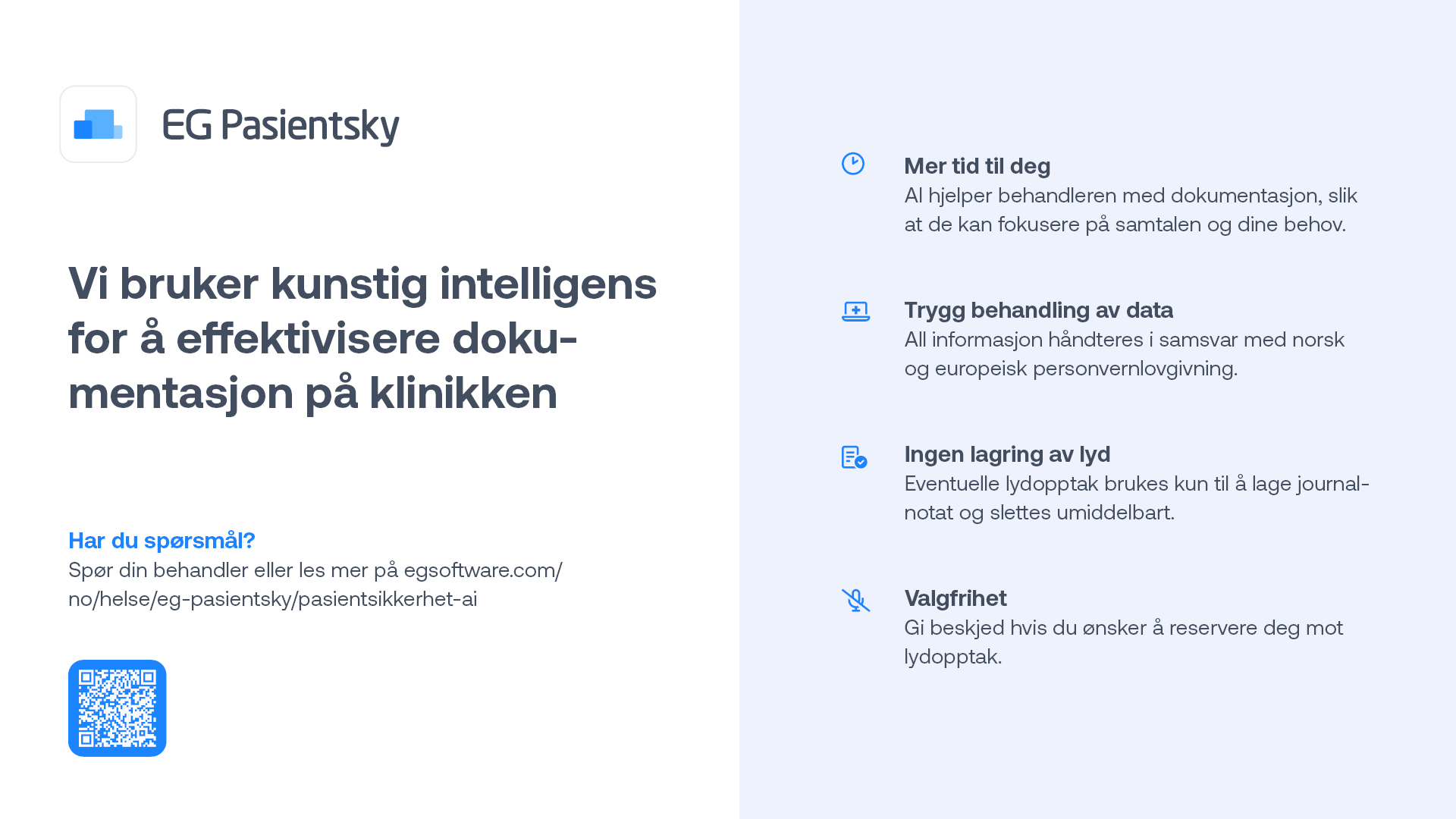 Vår AI-assistent gjør klinisk journalføring enklere, raskere og mer presis - direkte i EG Pasientsky, uten behov for tredjepartsløsninger.